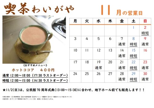 11月の営業日程 喫茶わいがや 2025.10.30 内容: 11月の営業日程は画像の通りです! 11/2(日)は、公民館70周年式典(13:00〜15:30)に合わせ、地下ホール前でも販売します! ※急病などで臨時休業する場合もあります。最新の情報はInstagram(下記)よりご覧ください。アカウントをお持ちでなくてもご覧いただけます。