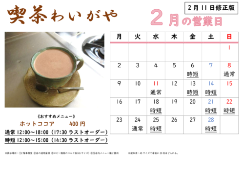 • 遅くなりましたが、2月の営業日程は画像の通りです!